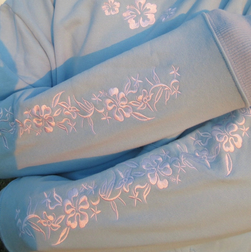 Adorned with delicate hand-stitched hibiscus blooms, adding a touch of artisanal elegance to your everyday wardrobe.