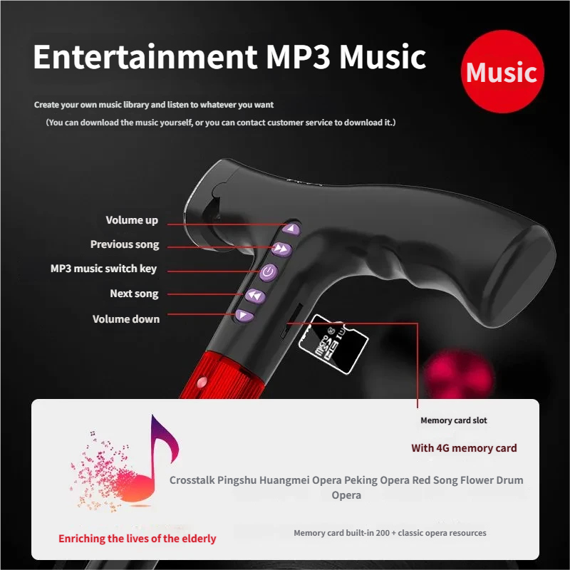 Designed for seniors in Europe and the US, this multi-functional anti-slip walking cane combines four essential features into one reliable companion: stable support, emergency alert, entertainment, and nighttime lighting. More than just a walking aid—it’s a 24/7 safety partner that promotes independence and peace of mind.